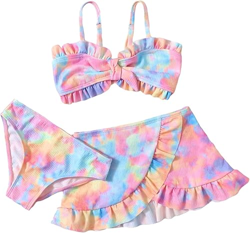 WDIRARA Toddler Girl's 3 Pieces Tie Dye Bikini Swimsuit with Ruffle Trim Beach Skirt