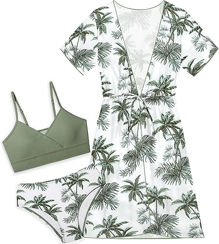 KANGKANG Girls Swimsuit 3 Piece Tropical Print Bikini Set V-Neck Bathing Suit with Drawstring Cover Up Girls' Swimwear 7-16T