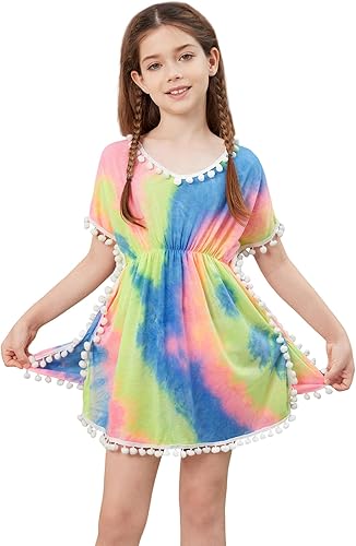 Milumia Girl's Cute Tie Dye Beach Coverups Pompom Trim Swimsuit Swimwear Cover Up