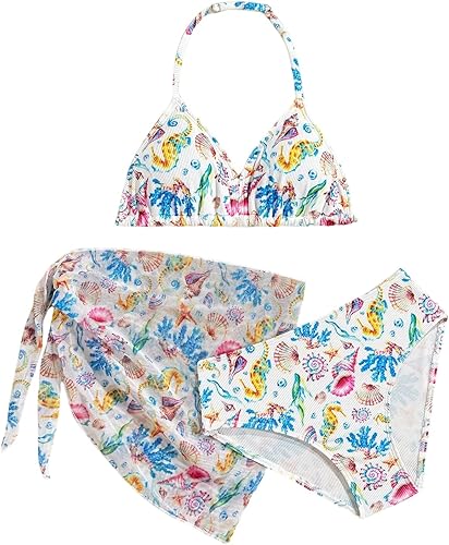 OYOANGLE Girl's 3 Piece Bikini Sets Floral Print Halter Triangle High Cut Swimsuits with Cover Up Skirt