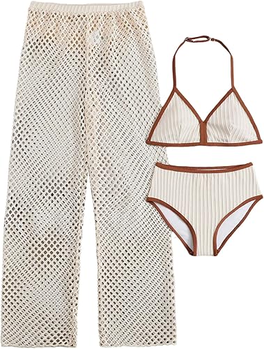 MakeMeChic Girl's 3 Piece Bikini Set Halter Contrast Binding Backless Swimsuit with Sheer Fishnet Cover Up Pants