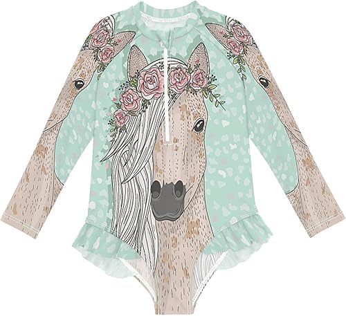 QUGRL Girls Rash Guard Long Sleeve One Piece Swimsuits Horse Flowers Zipper Girl Bathing Suits Size 9-10 Green Spring UV Swimwear Stand Collar