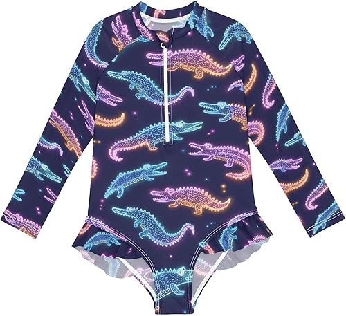 ALAZA Alligator Neon Black Girls One Piece Swimsuit Long Sleeve Rash Guard Swimsuits UV 50+ Swimwear Zipper