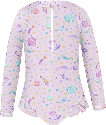 Wusikd Girls Long Sleeve Swimsuit Space Planets One Piece Bathing Suit Zipper Stars Pink Swimwear Sun Protection 5-6T