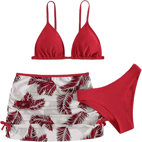 Girls 3 Piece Cute High Waisted Spaghetti Strap Swimsuit Kids Tropical Print Bikini Sets with Beach Skirt Swimwear