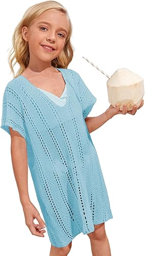 SOLY HUX Girl's V Neck Crochet Short Sleeve Beach Dress Summer Swimsuit Bikini Cover Up