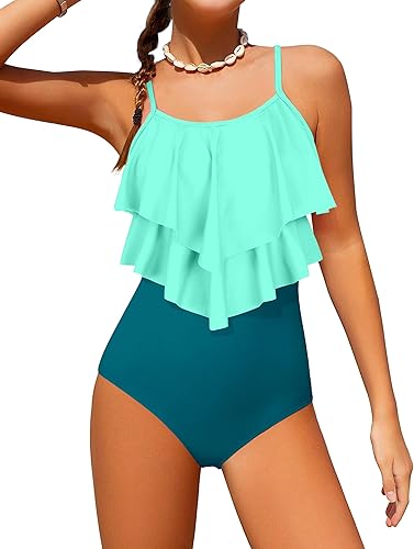 Girls Swimsuit Color Block One Piece Swimsuit 2-Tiered Ruffle Bathing Suit Adjustable Strap Girls' Swimwear 7-16Y