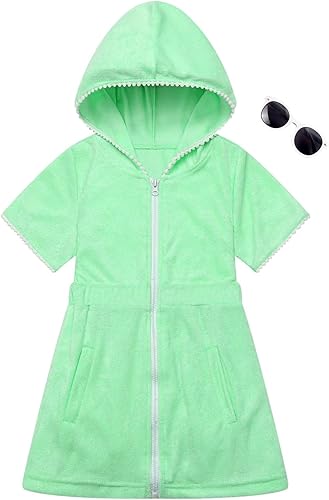 Girls Swim Cover Up Kids Beach Swimsuit Coverup Terry Zip-Up Bathing Suit Beach Pool Clothes with Sunglasses