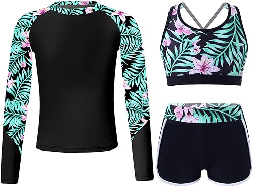 3PCS Kids Girls Swimwear Long Sleeve Rashguard with Crop Top and Shorts for Beach Pool Swimming