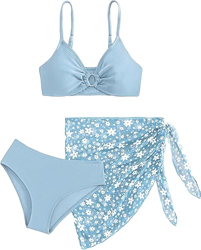 COZYEASE Girls' 3 Piece Bikini Set Ditsy Floral Print Wireless Swimsuit with Beach Skirt