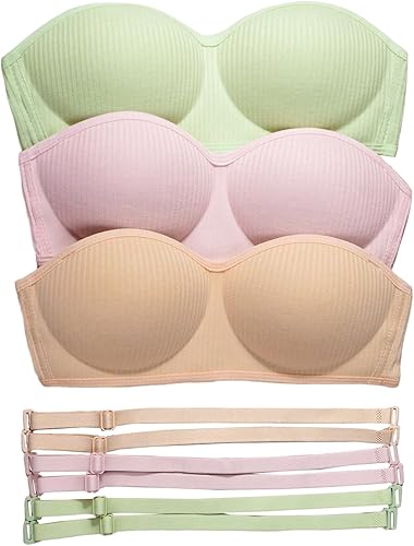 OYOANGLE Girl's 3 Pack Ribbed Strapless Bras Lightly Padded Everyday Training Bra with Adjustable Detachable Strap