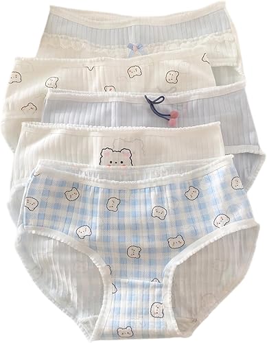 Cute Bear Korean Ruffled Panties for Teen Girls Breathable Cotton Fabric Mid Rise 5 Pairs Cartoon Anime Underwear (Medium) White