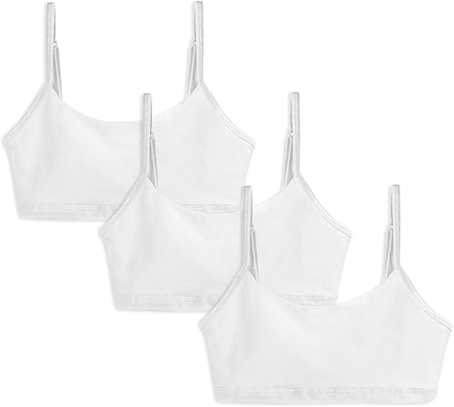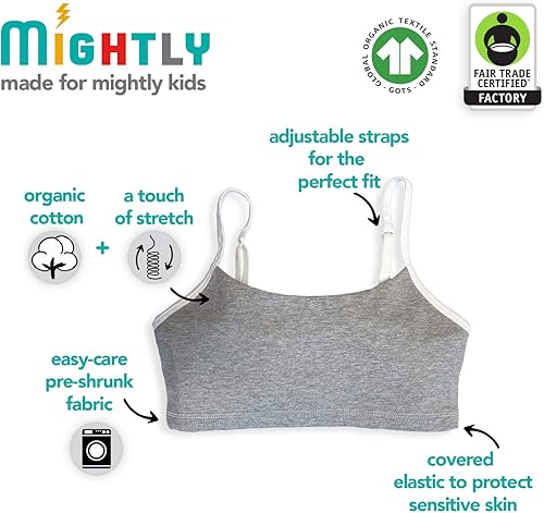 Mightly Girls' Bralette | Organic Cotton, Cami Crop Training Bra with Adjustable Straps, Soft and Fresh Dance & Sport & Gym Set for Kids and Teens, Fair Trade Certified 3-Pack, White, 14