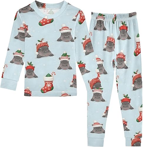 Pajama Sets Long Sleeve Christmas Hippo with Santa Hats Soft Comfy Sleepwear 2 Piece PJS 3-8T