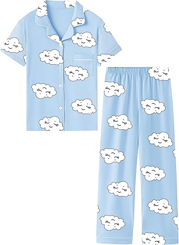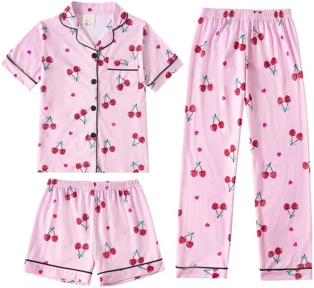 MyFav Girls Pajama Sets 3pcs Button Down Short Sleeve Top Shorts & Long Pants With Cute Patterns SleepwearNighty For Teens