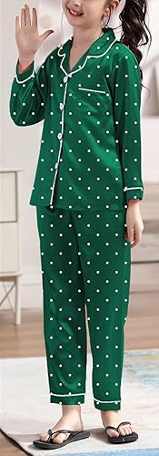 Schbbbta Girls & Womens Satin Pajamas Set, Silk Long Sleeve Nightwear Button-Down Sleepwear, 3 Years - Women XXL,Green Polka Dots, 5-6 Years