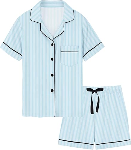 SANGTREE Girls' Short Pajama Sets Button Down Cotton Sleepwear 2PCS Lounge Sets Nightwear, Light Blue, 5-6X = Tag 130