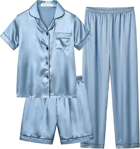 CYCHELRY Little Big Girls Satin Pajamas Summer Short Sleeve and Pants Button Down Silky PJS 3PCS Sleepwear Set Size 8-16