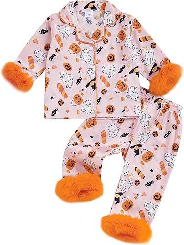 Toddler Baby Girl Satin Pajamas Set Silk Halloween Pjs Furry Cuff Button Down Top Long Pants Sleepwear Fall Clothes