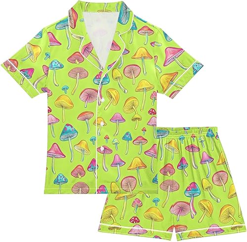 Blue Pink Yellow Mushrooms Pajamas Sets Short Sleeve Silk Stain Pjs Button Down Sleepwear for 5-14Y