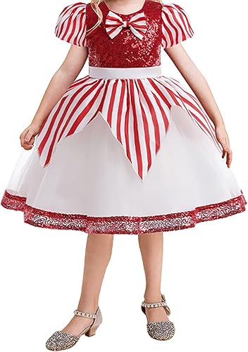 Girls Christmas Sequin Bow Dress Toddler Striped Elegant Puff Sleeve Tulle Princess Dress for Birthday Holiday Parties