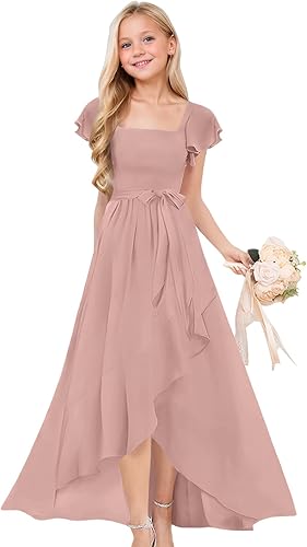 Junior Bridesmaid Dresses for Teen Girls Ruffle Short Sleeves Chiffon Wedding Guest Dress Slit Formal Party Gown