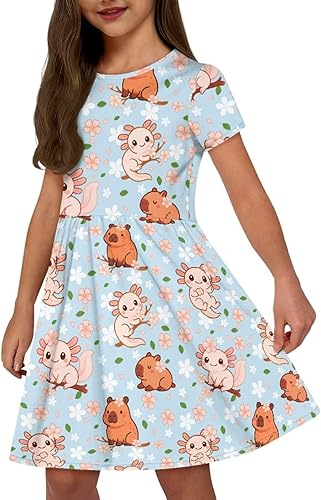 Girls Dress with Pockets Basic Short Sleeve High Waist Swing Skater Dress School Party Dress for Kids