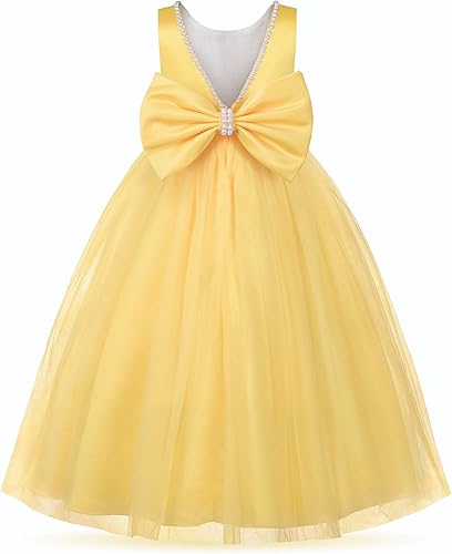Uhnice Flower Girl Pearls Dress V-Back Tulle Ball Gown Satin Prom with Bow-Knot for Wedding Pageant Birthday Party