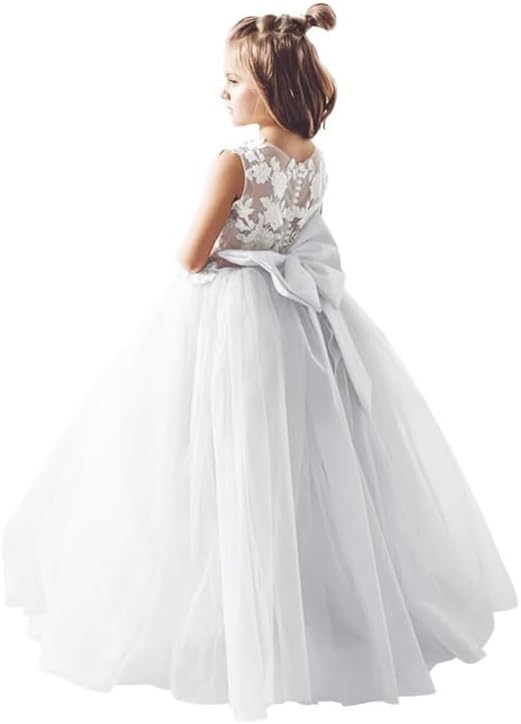 Lace Applique Tulle Flower Girl Dress Princess Pageant Party Dress Ball Gown with Bow-Knot