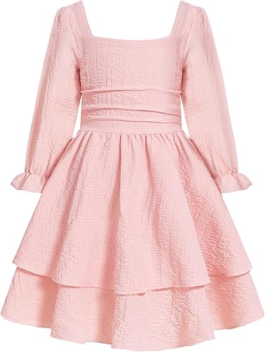 JiAmy Girls Dresses Square Neck Lantern Long Sleeve Ruched Smocked Back Double Layer Ruffle Dress
