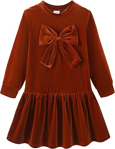 Girls Long Sleeve Dress: Toddler Girl Velvet Bow Tie Christmas Dresses for Casual Winter Holiday with 2-7T