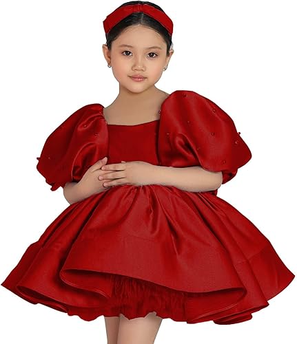 Flower Girl Dresses Puffy Sleeves Pearls Short Satin Kids Birthday Party Formal with Bow