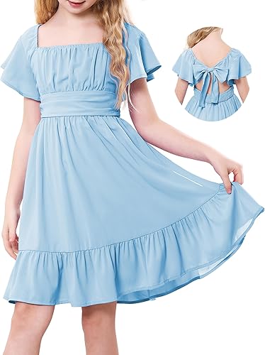 Durio Girls Summer Short Sleeve Dress Tie Back Off Shoulder Dresses for Teens Ruffle Tween Girls Dresses Size 6-16 Years