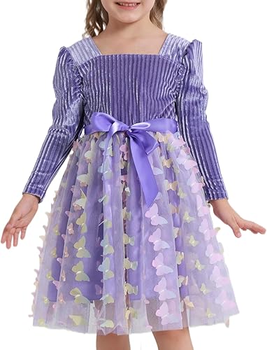 Little Girls Velvet Dresses Butterfly Layered Tulle Dress Long Sleeve Square Neck Tutu Dress Party Princess Dress 4-10Y