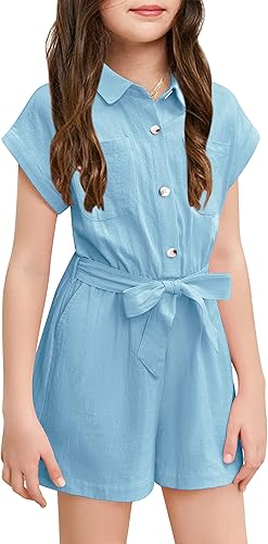 Mafulus Girls Cute Romper Button Down Belted Jumpsuit Wide Leg Short Summer Outfits with Pockets 3-14T