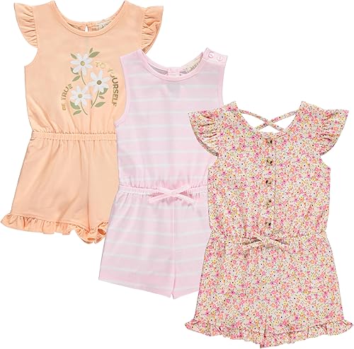 BTween Girls 3 Pack Romper Set Cute Comfy Sleeveless Summer Jumpsuits for Kids Floral, Striped Solid Designs (4-16)