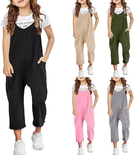 Linen Rompers for Girls Loose Overall Shorts Adjustable Strap Summer Casual Sleeveless Jumpsuit with Pockets for 5-14 Years