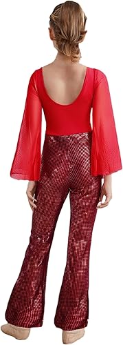 Kids Girls Disco Dance Outfit Sheer Mesh Patchwork Long Flared Sleeve Metallic Bell Bottom Jumpsuit Red 10 Years
