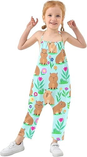 Cartoon Capybara Flowers Field Toddler Girls Jumpsuit Backless Romper One Piece Sleeveless Pants Summer Clothes,1T