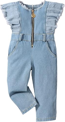 Toddler Girl Sleeveless Denim Jumpsuit Fly Sleeve Front Zipper Jeans Romper Overalls One Piece Summer Clothes