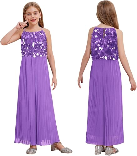 Loyan Teen Girls Sparkly Wide Leg Romper High Waist Ruffle Pants Shiny Jumpsuit Prom Party Formal Suit Purple 10 Years