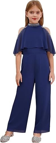 Kids Girls Cold Shoulder Sparkly Jumpsuit Romper One Piece Wide Leg Pants For Wedding Party Navy Blue 8 Years