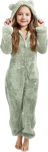 Girls Zip up Fleece Jumpsuits Plain Plush Soft Hooded Romper Teen Kids Fuzzy Padded Warm Bedroom Halloween Bodysuits