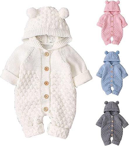 Infant Boys Girls Knit Sweater Romper Baby Toddlers Long Sleeve Hooded Button Up Winter Outfits with Pocket