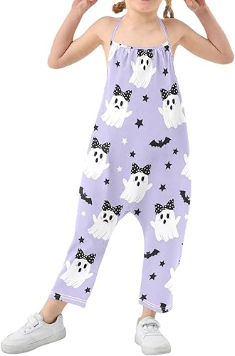 Toddler Girls' Sleeveless Jumpsuits Cute Ghosts with Bows Flying Casual Summer Rompers with Pockets for 1-6T