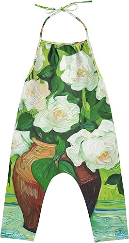 Toddlers Rompers Baby Jumpsuits Girls Vase White Roses Green Leaves Overall Halter Cute Summer Clothing 12m