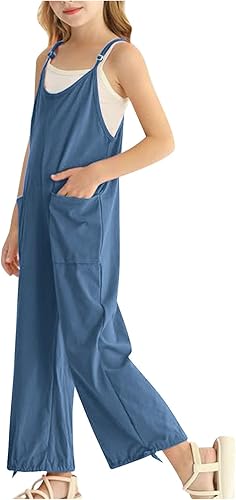 Girls Overalls Kids Loose Casual Sleeveless Jumpsuits Harem Pants One Piece Rompers with Pockets (Blue #3, 10-12 Years)