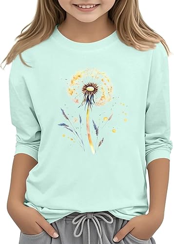 Girls Summer 3/4 Length Sleeve Tee Tops Crewneck Shirt Casual Athletic Tops Teens Floral Patterned School Uniforms