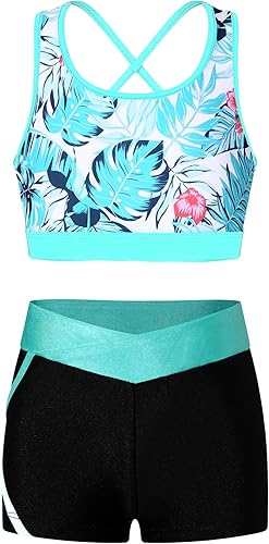 Hansber Kids Girls Crop Top with Booty Shorts Set 2 Piece Dance Sport Outfits Gymnastics Leotard Dancewear Swimwear