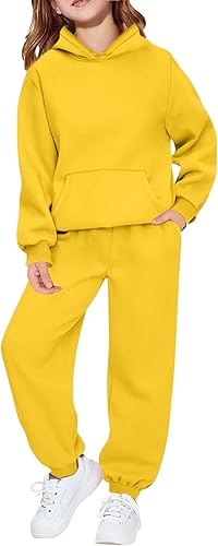 Girls 2 Piece Outfits Fashion Jogger Sweatsuits Solid Hooded Sweatshirt and Sweatpants with Pockets Kids Tracksuit